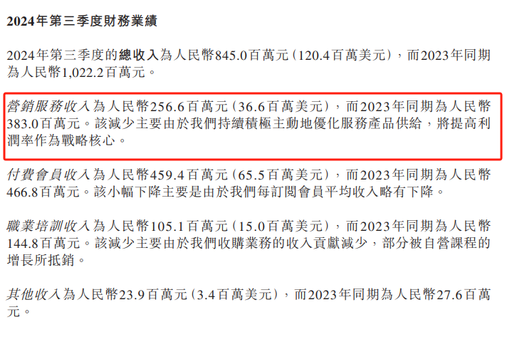 2021—2023年,知乎的年度营收规模从29.6亿元扩张到了41.99亿元,截至2024年第三季度,付费阅读业务收入同比增加48.4%,贡献了知乎的一半营收,营销服务业务则在三成左右。