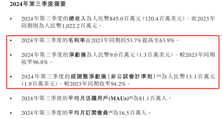 与此同时,AI技术赋能后,其2024第三季度净亏损同比收窄96.8%至900万元,再次创造上市以来减亏幅度最大且净亏损额最少的单季记录;同期,毛利率增了10个百分点,创下63.9%的历史新高。