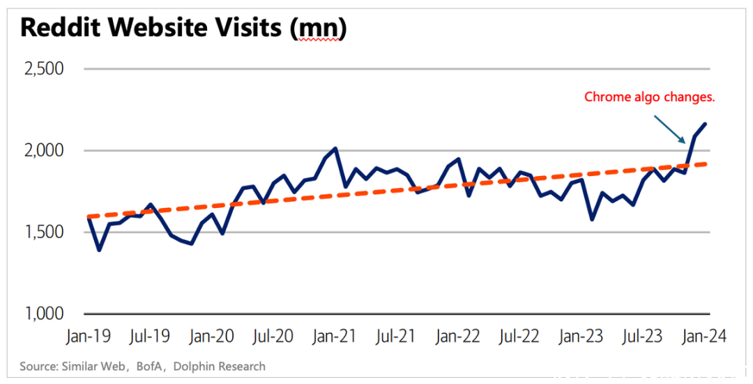 2023下半年,Reddit成功抓住了谷歌的橄榄枝,双方展开合作。根据合作协议,双方通过调整搜索算法,使Chrome的搜索结果中Reddit链接的透出比例大幅提高,并将其置于更靠前的位置,说是谷歌将其全球30亿的庞大流量直接输给Reddit也不为过。